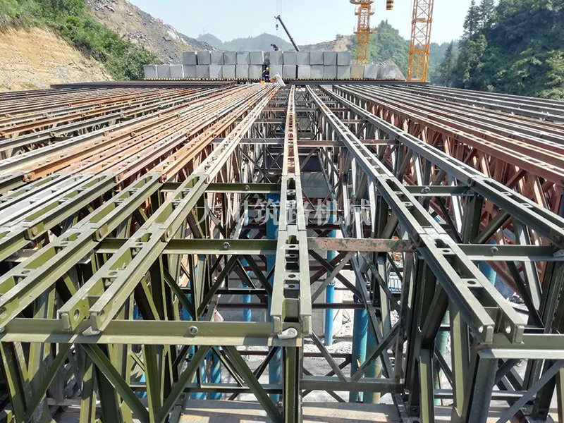 特點(diǎn):現(xiàn)澆梁支架平臺(tái)的跨度大,高度高,施工現(xiàn)場場所地非常有限,在局促的場地中和其他施工隊(duì)伍的場地需交叉作業(yè)。安裝過程中因拼好的主梁沒有平整的場地放置,需要在拼好的貝雷片上面拼裝對接;有些梁也因場地原因致使吊機(jī)沒有好的停車位,不能整根梁吊裝,采用半根梁吊裝在空中對接方式完成安裝,施工難度較大。